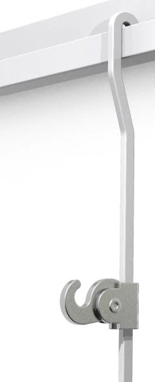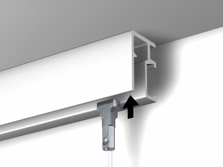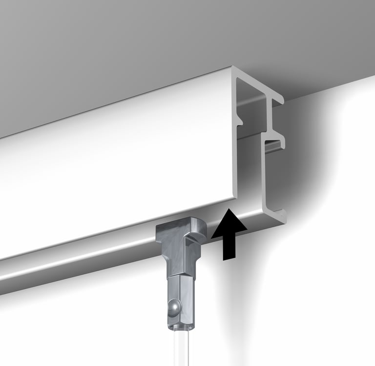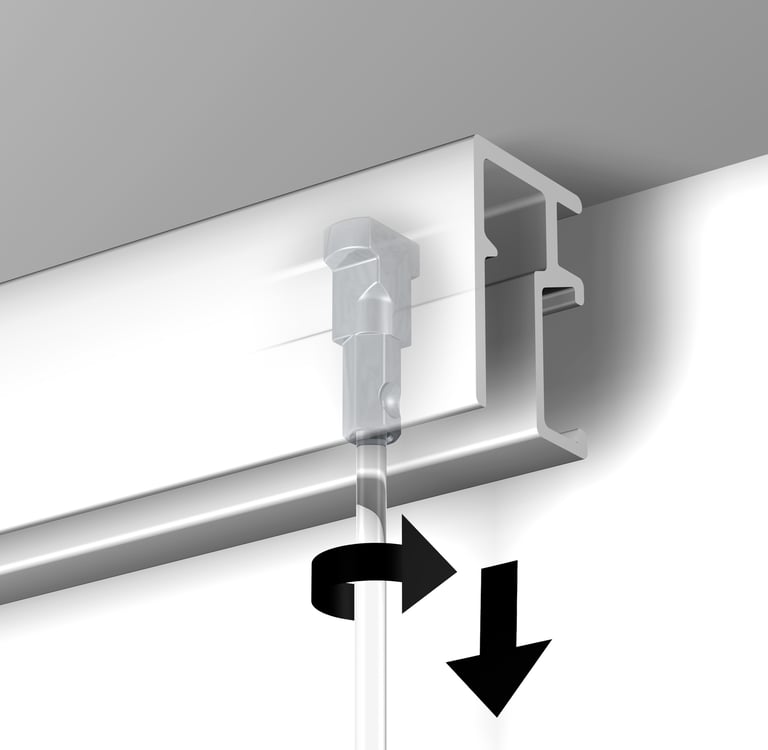 If you need to hang several works at the same height, it's often easier to get all the hooks positioned on the cords first. Insert one cord into the hanging rail and get the hook height right - then remove it and use it as a master to line up all the other cords and hooks on a flat surface.